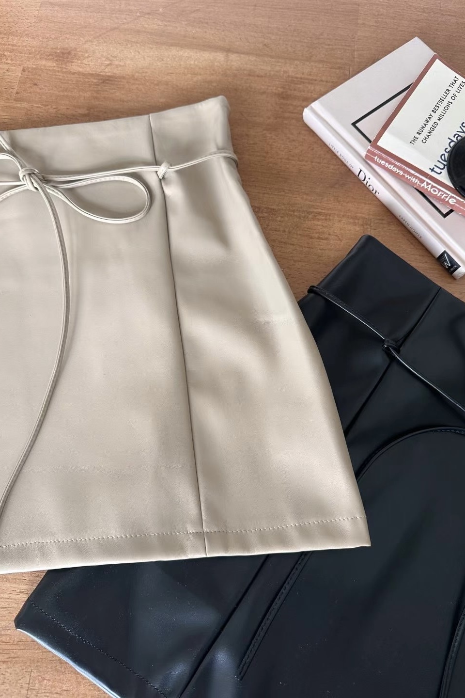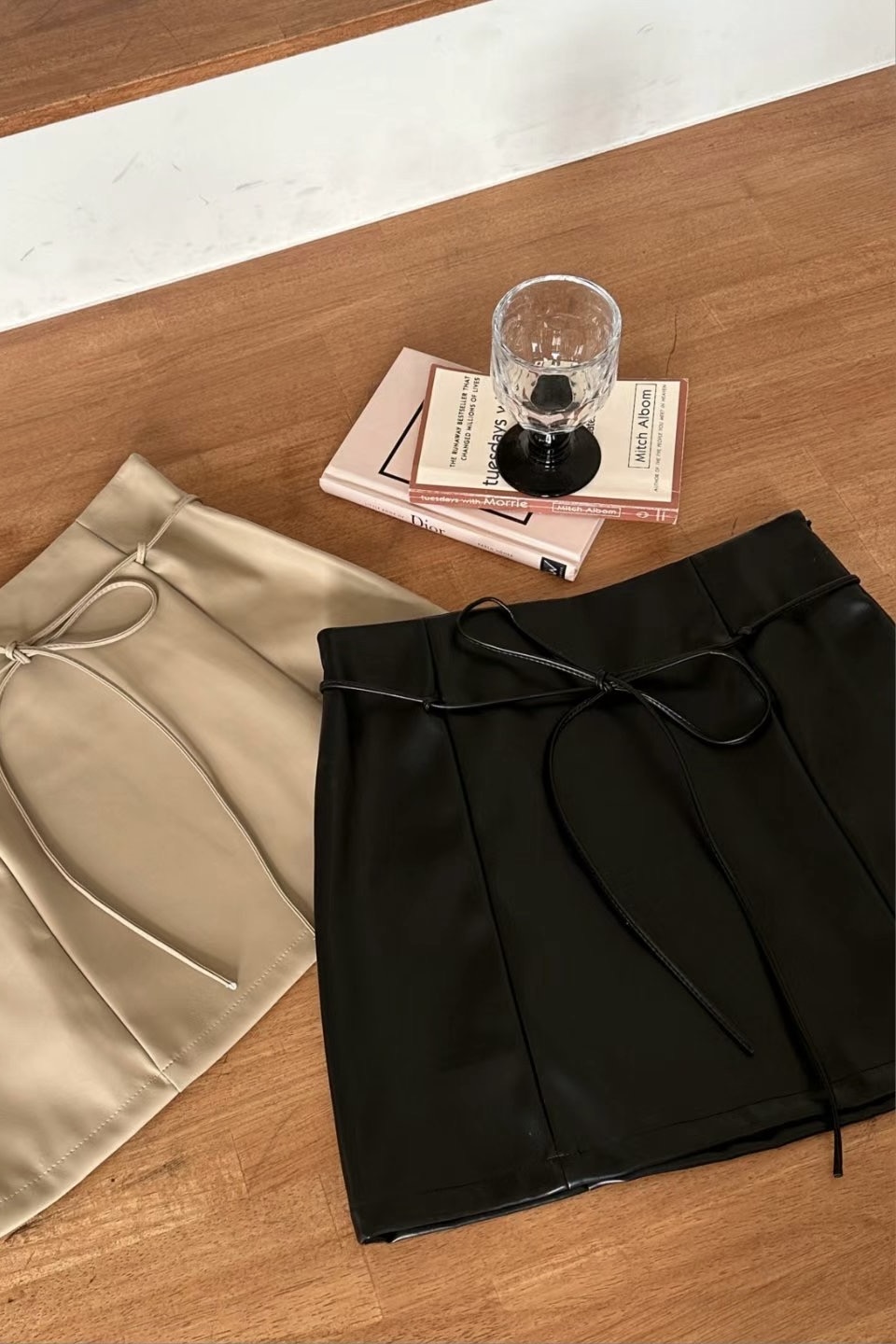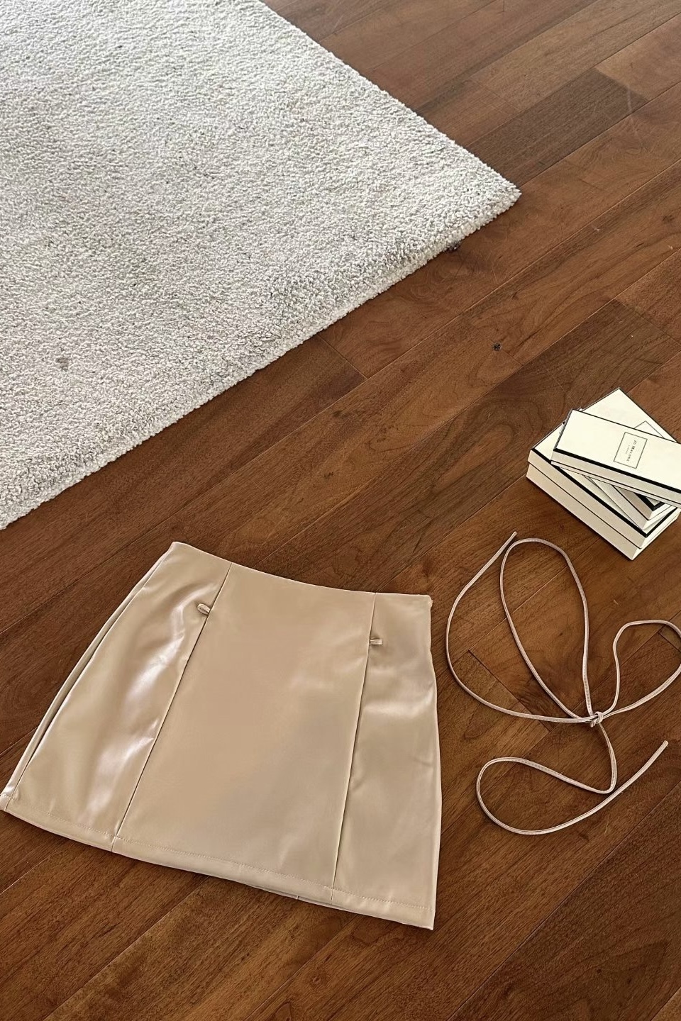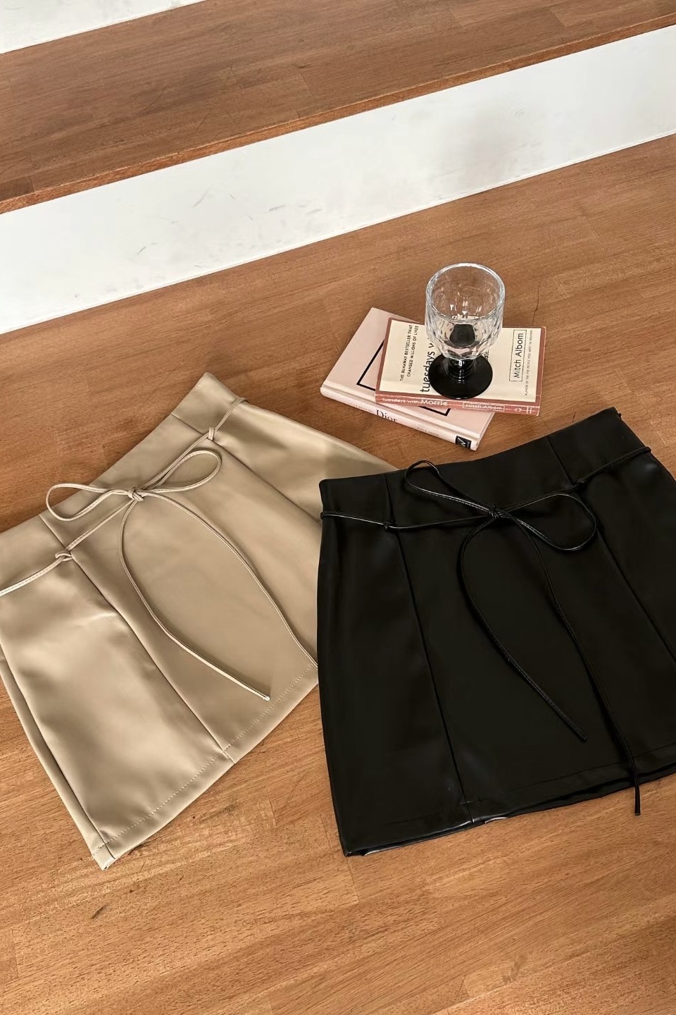 It is a leather skirt that can be created in a variety of moods. It is a set product that goes with a string, and it is a unique design that connects the string to a ring fixed at the waist and wears it as a belt. It goes well with all oversized products and bloody tops, so it is a skirt that can be stored for a long time that does not go out of style.