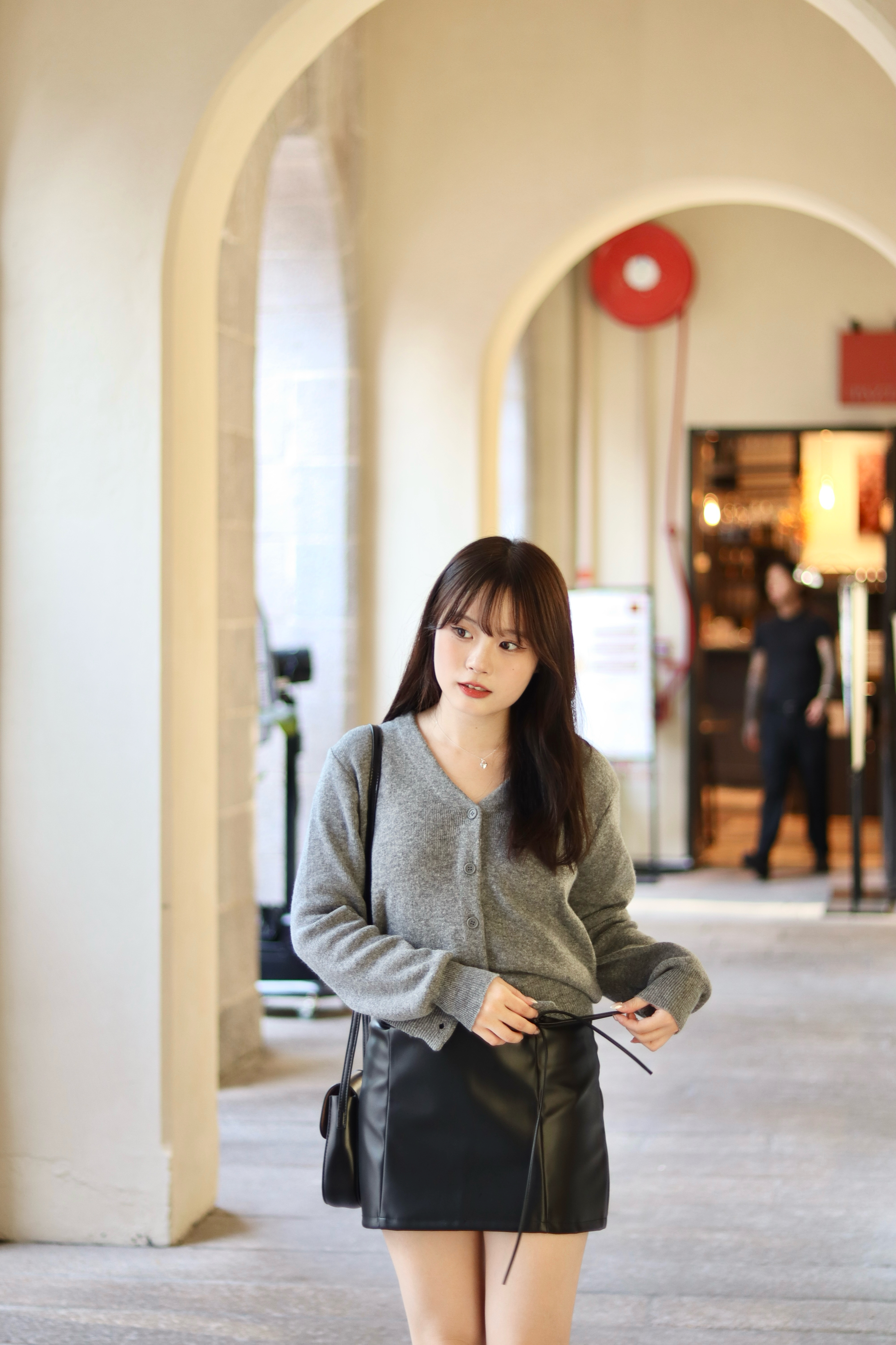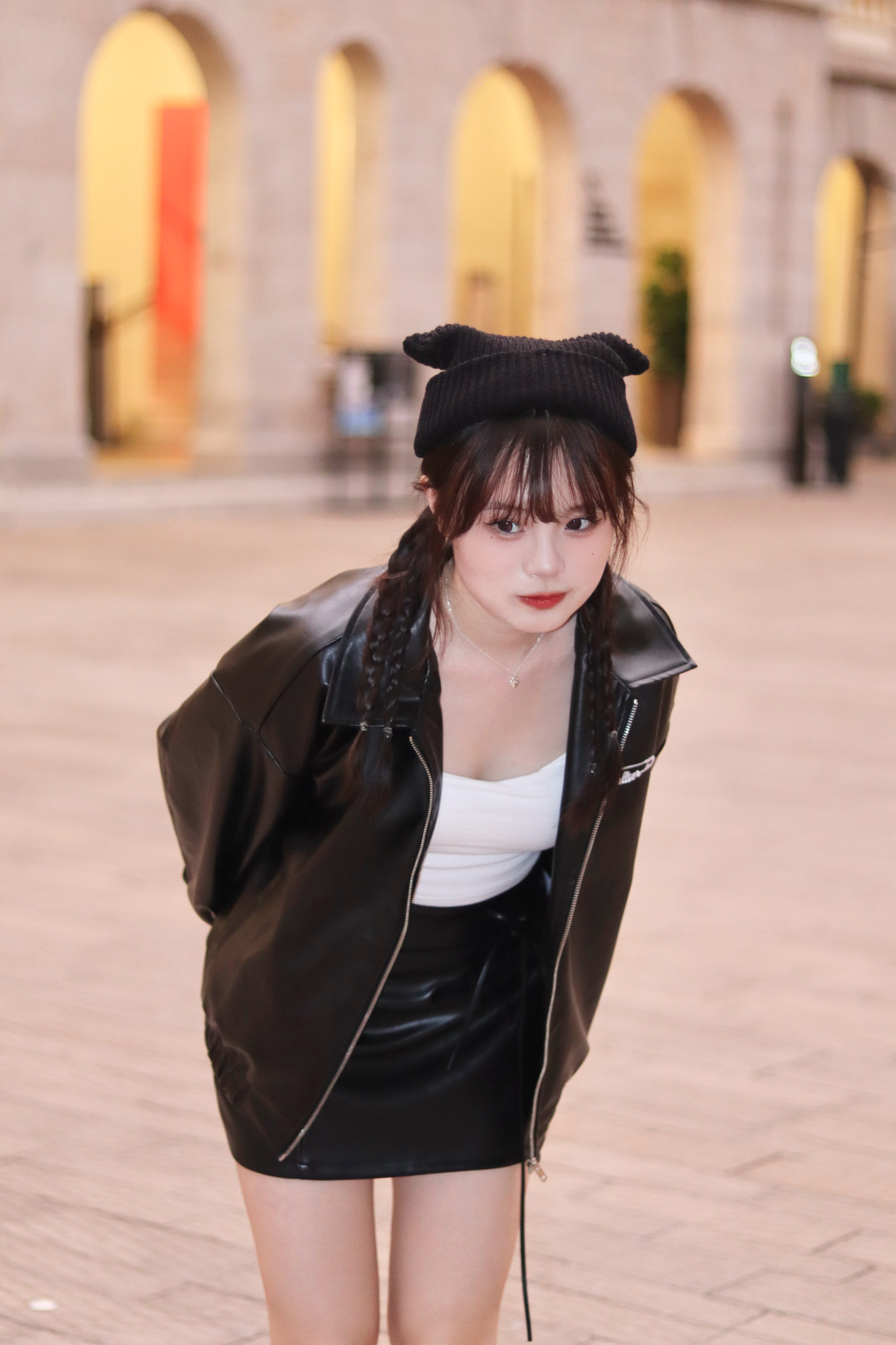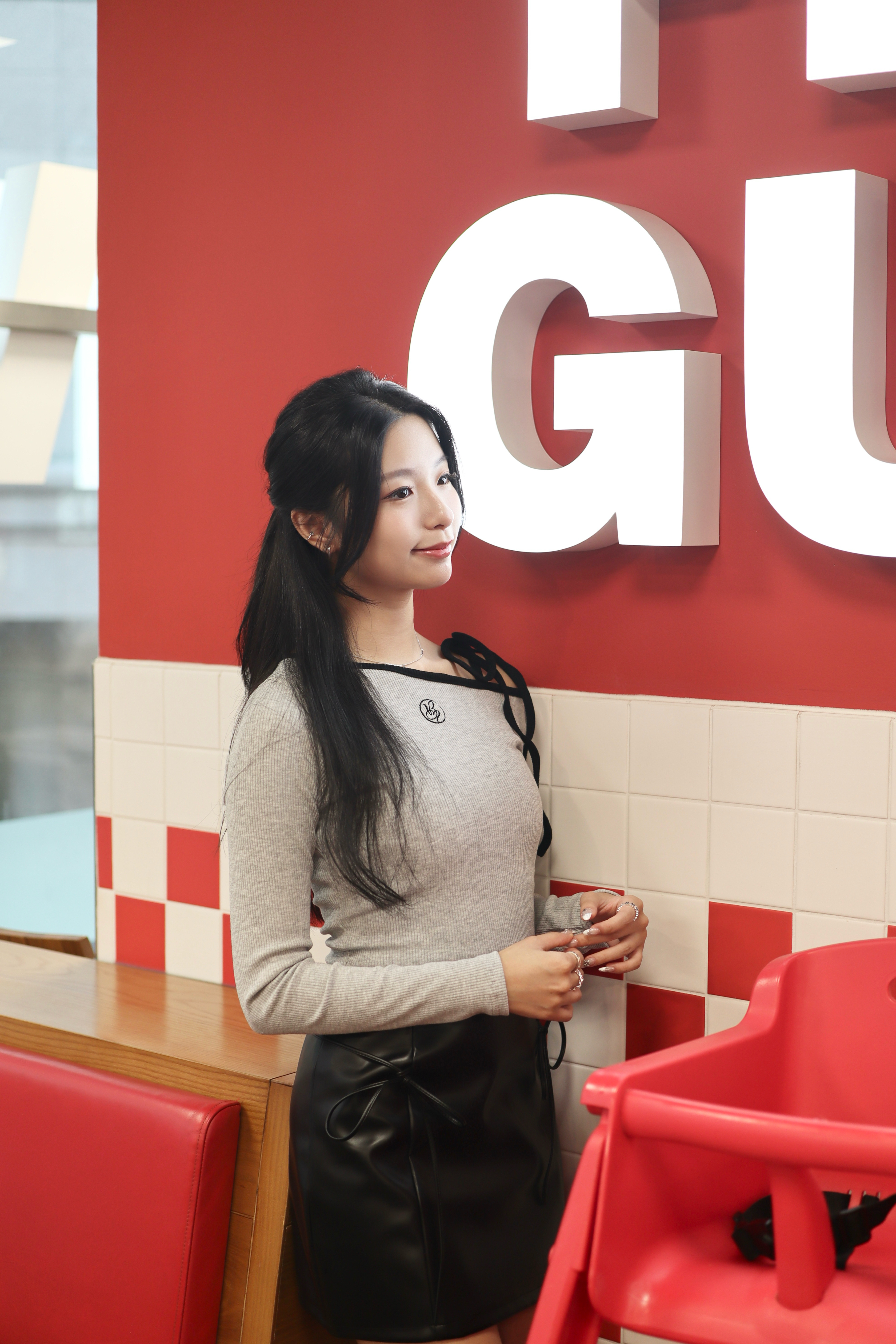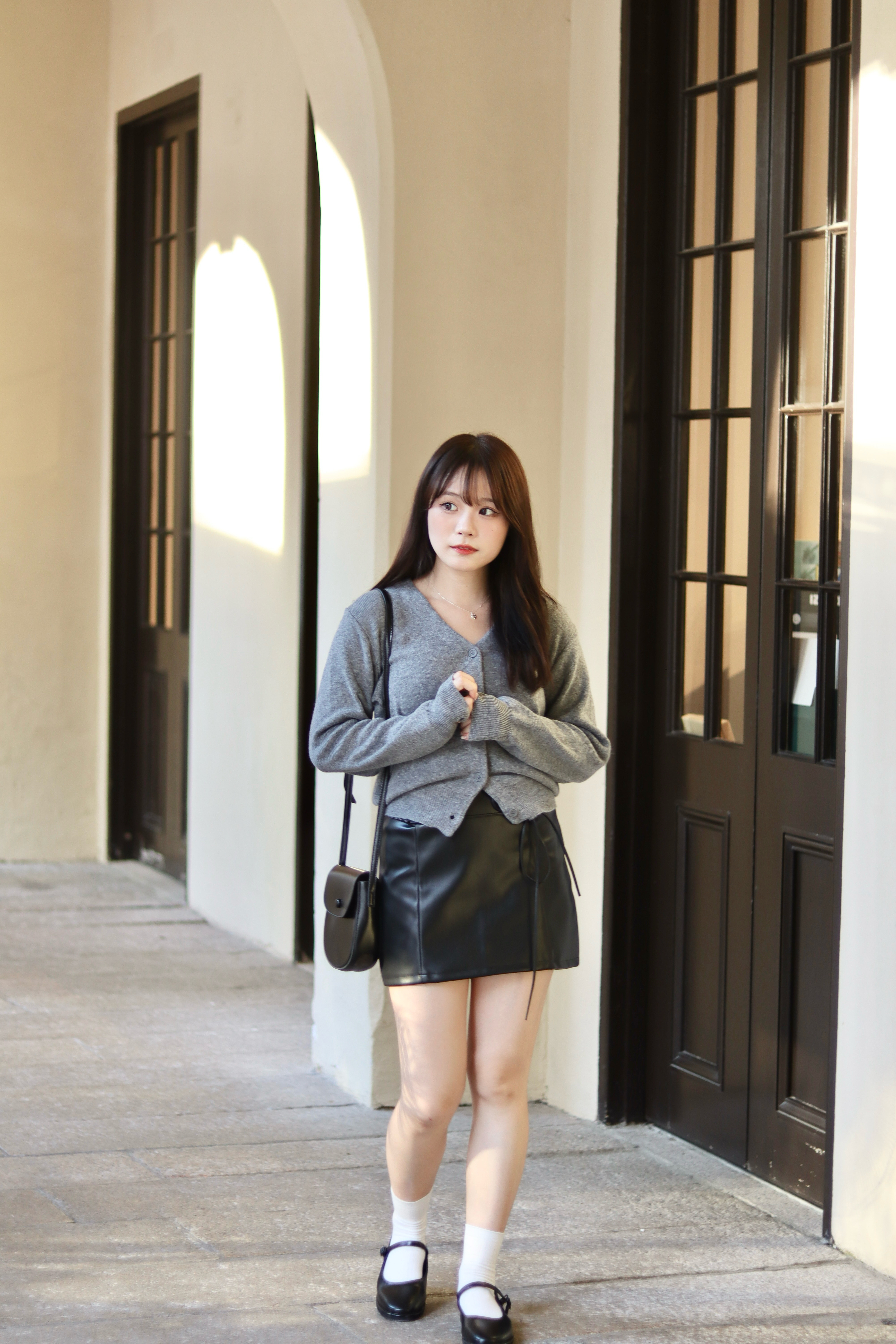 It is a leather skirt that can be created in a variety of moods. It is a set product that goes with a string, and it is a unique design that connects the string to a ring fixed at the waist and wears it as a belt. It goes well with all oversized products and bloody tops, so it is a skirt that can be stored for a long time that does not go out of style.
